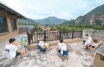 在位于山西省左權(quán)縣澤城村的中國北方國際寫生基地澤城驛站內(nèi),山西工學(xué)院的學(xué)生們在畫畫。新華社記者 楊晨光攝