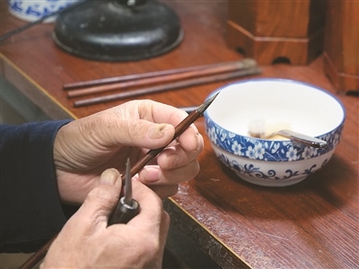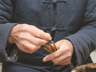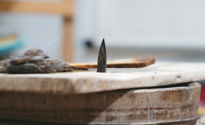 “無論是制作哪一類品種的宣筆,要能實(shí)現(xiàn)‘尖、齊、圓、健’均屬不易,需經(jīng)歷選料、水盆、制桿、裝套等多道工序、100多個(gè)環(huán)節(jié)?!币灾茥U為例,佘征軍介紹,工人需要先將筆桿磨平,再用工具在筆桿上挖出裝筆頭的洞,這套工藝沒有特定的參數(shù)可參考,全憑工人的手上感覺。“學(xué)徒入行,一般3到5年才能完整學(xué)會(huì)宣筆制造流程;要想做出一支優(yōu)秀的宣筆,至少10到12年的學(xué)習(xí)實(shí)踐;而要想學(xué)‘精’,需要一輩子的時(shí)間?!辟苷鬈娬f。