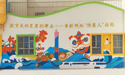 清晨,太陽(yáng)剛剛升起,新疆伽師縣西克爾庫(kù)勒鎮(zhèn)中心幼兒園內(nèi),一群背著畫(huà)板、提著顏料箱的年輕人已開(kāi)始忙碌。剛翻新的幼兒園墻面成為他們的畫(huà)布,大海與雪山、醒獅與烤馕、廣州塔與喀什高臺(tái)民居等粵新兩地文化元素在此相遇。百人共繪的畫(huà)卷(局部見(jiàn)圖),不僅點(diǎn)亮邊疆孩子們的藝術(shù)星空,也滋潤(rùn)著共創(chuàng)者的心靈。